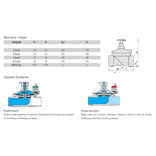 Zawory odporne na korozję, wykonane z wysokiej klasy tworzywa sztucznego, gumy syntetycznej i stali nierdzewnej. Duży zakres ciśnienia i przepustowość. Płynne otwarcie i zamknięcie. Samooczyszczalne elementy. Możliwość ręcznego otwarcia elektrozaworów w przypadku braku energii elektrycznej. Mały pobór energii elektrycznej.